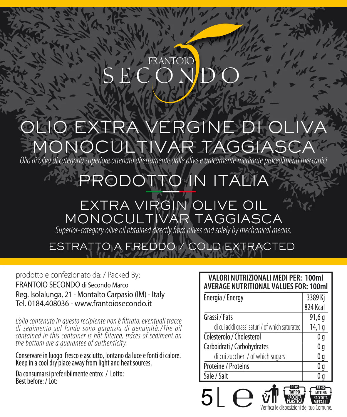 FRANTOIO SECONDO: Olio ottenuto dalla lavorazione di olive del tipo taggiasca, unicamente mediante procedimenti meccanici. I delicati sentori di mandorla, il colore giallo intenso e la delicata dolcezza lo rendono unico.